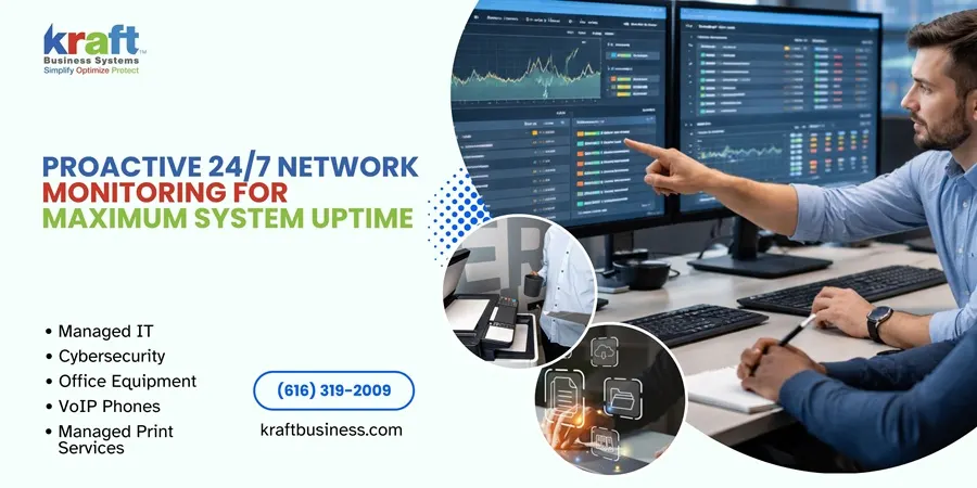 Today’s businesses depend on reliable networks. When those networks fail, productivity and revenue stop. Continuous, proactive 24/7 network monitoring and alerting is the practical way to keep operations running and sensitive data protected. Below, we explain why always-on monitoring matters, what it covers, and the advantages of a managed approach. We also outline how Kraft Business Systems customizes monitoring programs for Michigan organizations so you can protect your IT infrastructure and keep work moving.